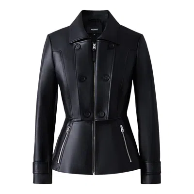 BARBARA is a jacket crafted from premium leather. The fitted silhouette is accentuated by a feminine peplum hem while the placket covers the front zip closure for alternate styling. Adjustable sleeve cuffs with buttoned tabs ensure a tailored fit, while zippered front pockets provide functional storage. The wide collar adds dramatic lines to the classic design. 100% lamb leather jacket Fitted silhouette with peplum hem Adjustable sleeve cuffs with tab and button Center front zipper closure Zippered pockets Wide collar Fully lined SIZE & FIT FITTED – Our signature fit, closest to the body. Designed to be worn with light layers, all while keeping you warm. For heavier layering, we recommend sizing up. The model is 5'11" (180 cm) and wears a size S. Coat length from shoulder to hem: 24 ¼'' / 62 cm. COMPOSITION & CARE INSTRUCTIONS Shell: 100% lamb leather. Lining: 100% polyester. Dry clean by a leather specialist using only oil-based solvent. Do not use perchloroethylene. "