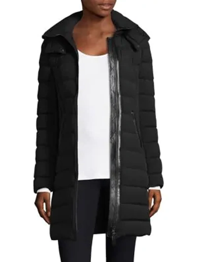 Lightweight coat featuring a quilted exterior Removable hood with D-ring Stand collar Long sleeves Exposed front zip Side welt pockets Lined Water repellent Two-way stretch 850+ fill power Comfort zone down to -10°C/14°F About, 34" from shoulder to hem Nylon/spandex Fill: Goose down/feathers Dry clean Imported Model shown is 5'10" (177cm) wearing size Small. Style code : 0400095823602 BLACK