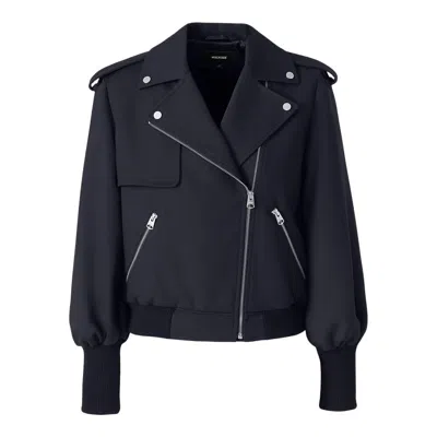 PONY is a cropped moto jacket made from responsibly-sourced wool gabardine. Tailored to a semi-fitted silhouette, it features an asymmetrical front zipper, waist pockets with zippers, and structured lapels for a bold look. Rib knit cuffs and waistband add comfort and shape, while rain shedders enhances weather protection. Belt loop accents and balloon sleeves complete this modern reinterpretation of a classic moto style.