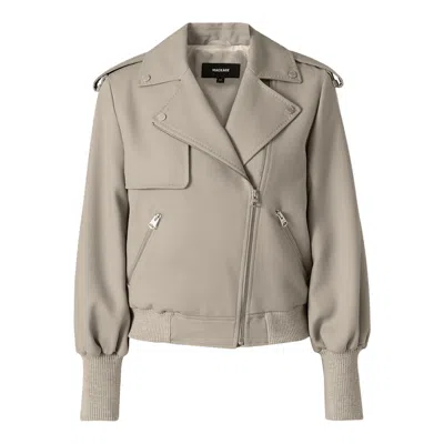 PONY is a cropped moto jacket made from responsibly-sourced wool gabardine. Tailored to a semi-fitted silhouette, it features an asymmetrical front zipper, waist pockets with zippers, and structured lapels for a bold look. Rib knit cuffs and waistband add comfort and shape, while rain shedders enhances weather protection. Belt loop accents and balloon sleeves complete this modern reinterpretation of a classic moto style.