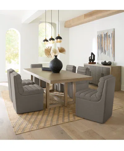 Exclusively at Macy's, the 7-Pc. Dining Set, featuring the Portmore Rectangular Dining Table and six Clave dining chairs, effortlessly blends modern style with everyday comfort. The chairs showcase sleek channeling, plush cushions, and hidden casters for easy mobility, while the table combines textured wood with custom hardware, striking the perfect balance between rustic and contemporary-versatile for any space.