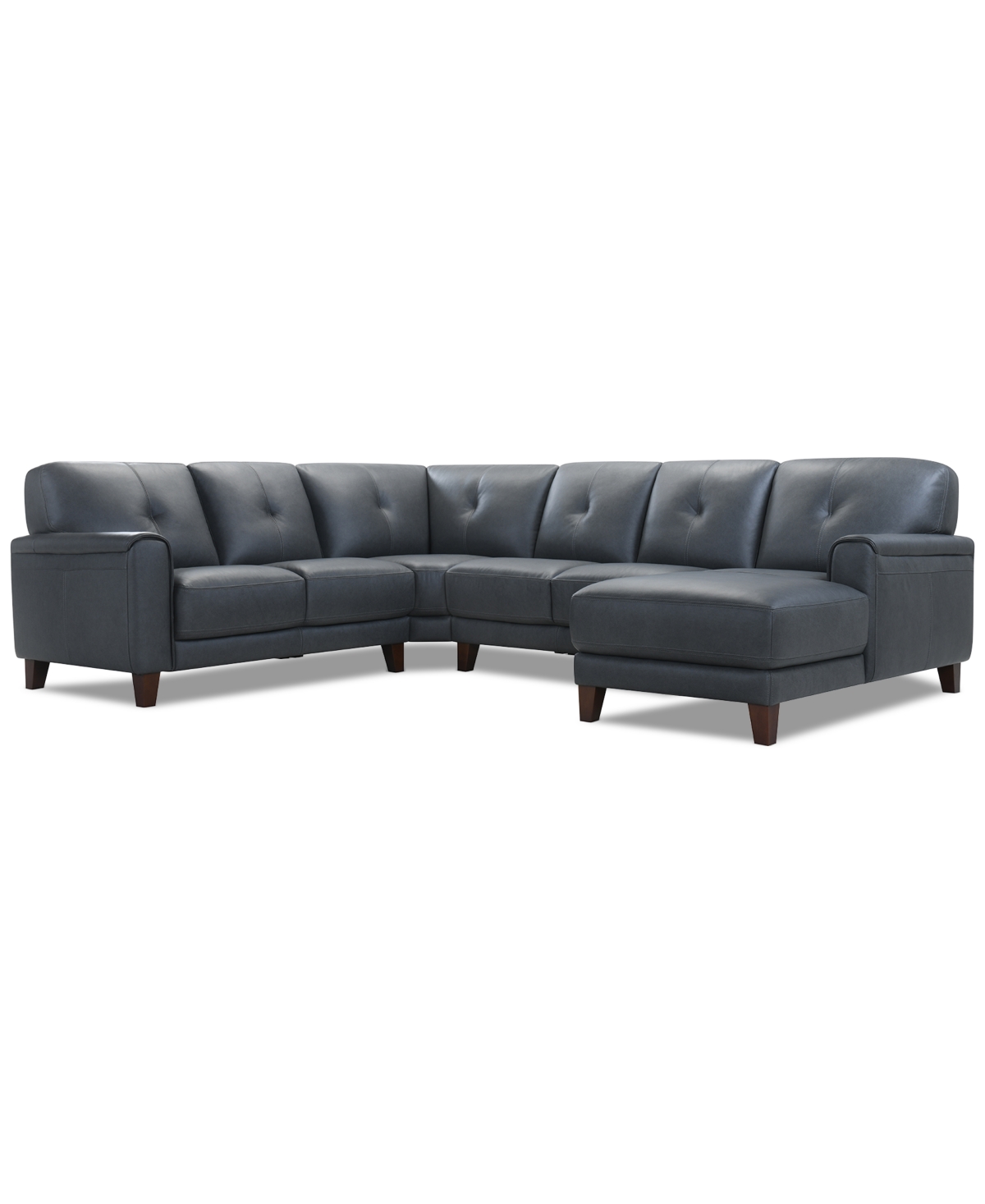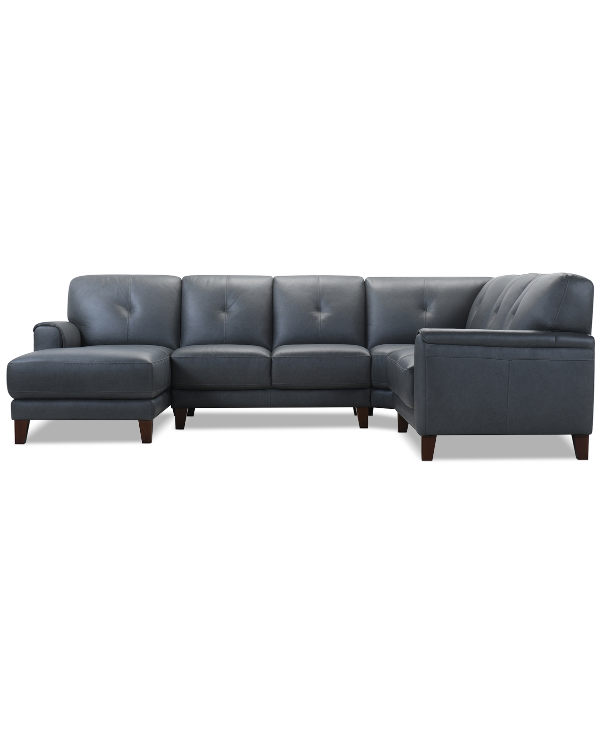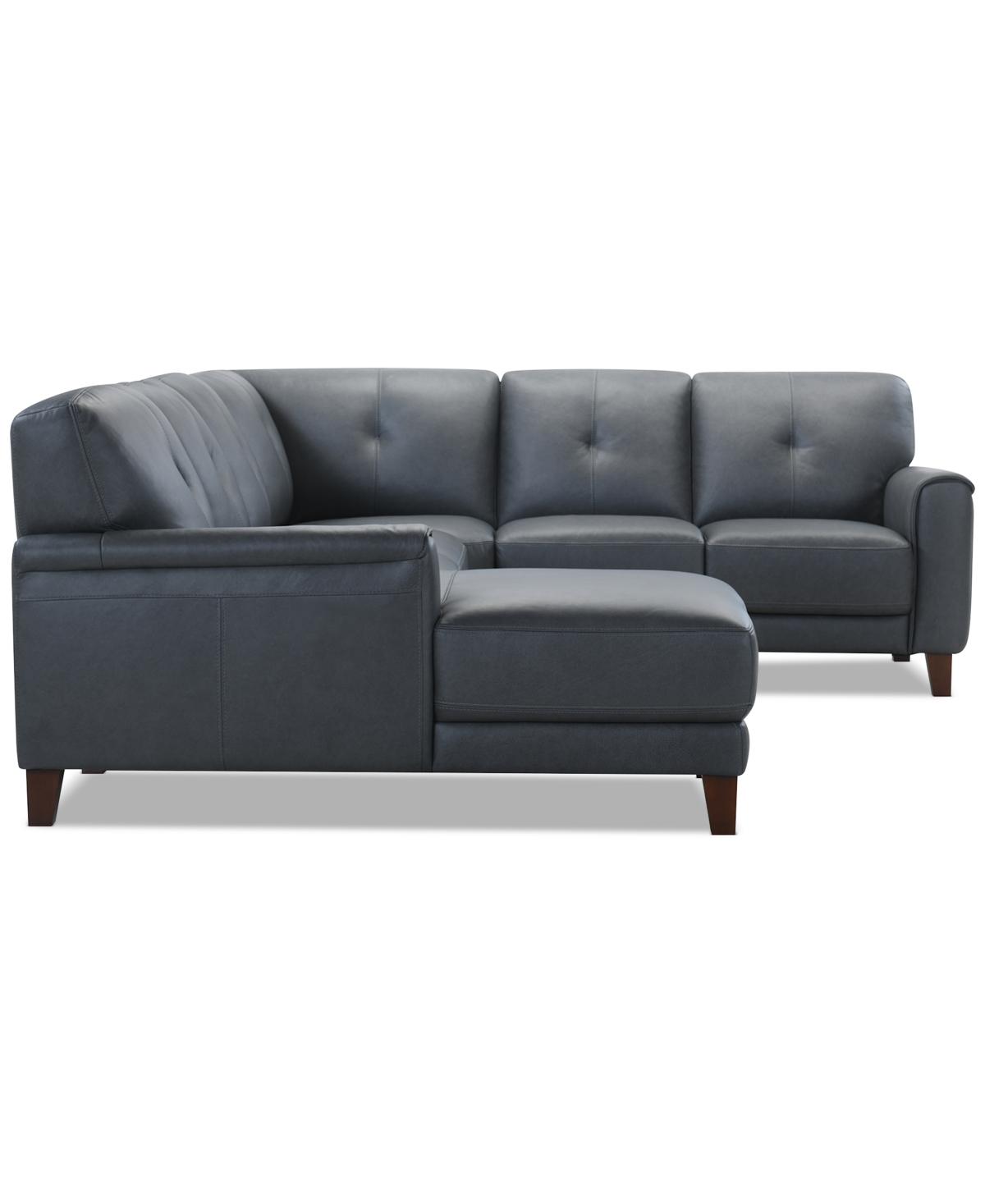 Classic style is made fresh with the updated lines of this handsome four-piece sofa and chaise sectional. From padded arms, an open base, to minimalist tufted back cushions, the piece speaks of dignified fashion while superior comfort is provided by the feel of soft leather over supportive foam cushions.