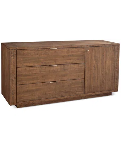 The Baleigh Server marries a modern silohuette with a relaxed, lightly distressed toffee finish in a dining side piece with the perfect casually elegant style of today's dining rooms. A modern plinth base and tastefully appointed satin brass hardware creates extremely clean lines that displays the natural beauty of the wood expertly. Three drawers and a door allow for plenty of storage base of any dining area in a neat, beautiful package that can stand on its own or can be paired with the matching Baleigh dining collection.
