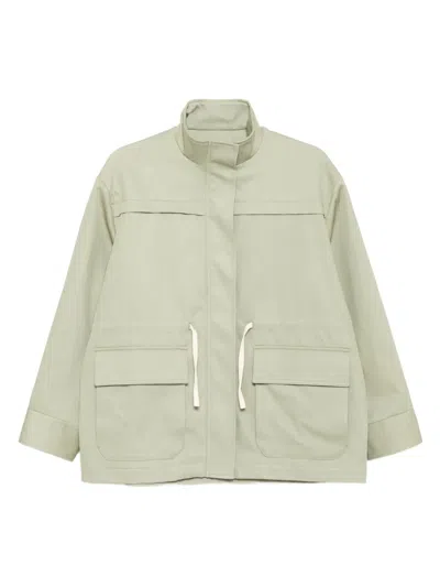 High collar with snap closure Snap closure and hidden zipper Long sleeves finished off with straight snap cuffs Drawstring waist Two side slash pockets with flaps Bold Fox Head embossed leather patch at the back Tone-on-tone bias interior trim