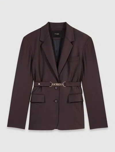 The studio unveils its new collection, the epitome of Parisian chic. Elegance and sophistication unite in a subtle interplay of contrasts and proportions, giving your looks a confident, modern edge. The waist is discreetly accentuated on this long-sleeved suit jacket with lapel collar. Both chic and structured, it features a removable belt with curb chain links - this season's hottest accessory. Add matching trousers for an elegant silhouette, and set off with slingback pumps. Fitted suit jacket Removable curb chain belt Long sleeves with buttoned cuffs Brown TUK 14 / FR 42 Maje