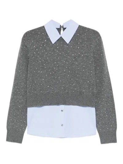 grey crystal embellishments layered design detachable shirt-layer long sleeves crew neck