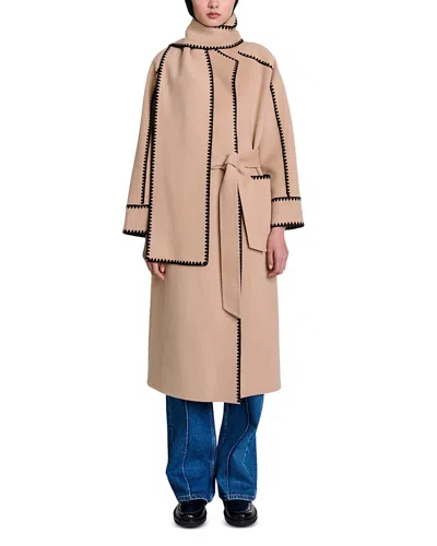 Maje wool-blend coat82% wool, 18% polyamideSelf-tie fasteningRegular fit, lapel collar, removable scarf with pressed stud fastening, long sleeves, two patch pockets at front, contrasting edges, brushed textureSpecialist dry cleanTrue to sizeMidweight, non-stretch