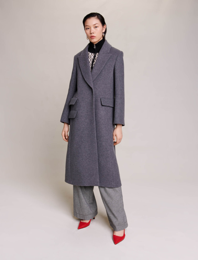 Maje wool Grey. This This season, the collection is inspired by the British wardrobe and gives the classic a bold new twist to create totally irresistible outfits. Inspired by menswear, this long, straight-fit coat is the perfect embodiment of effortless chic. With long sleeves, it features a turn-up collar, a double-breasted design and flap pockets. With its tailored effect and clean lines, it creates a sleek, structured silhouette and adds a touch of elegance to your look. Ideal for warming up in style, it's perfect with a jumper, skirt and boots. Ref: Mfpou01080 Long straight coat Flap pockets Button fastening