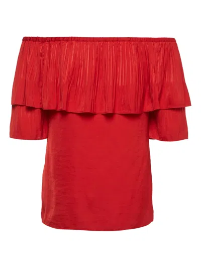 red layered ruffles off-the-shoulder neckline short sleeves Condition: GOOD. This previously owned and used item is in good condition with minimal signs of use. This may include fading of material or plating and scratches.