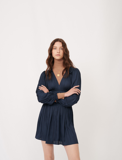 Maje polyester Navy. This Satin dress with fancy ruffles and smocking at the waist, made from a bright fabric. Defined waist, low cut neck and long sleeves, gathered at the cuffs, Short dress, Ref: Mfpro01481, Sophie is 5'11'' and is wearing a size S