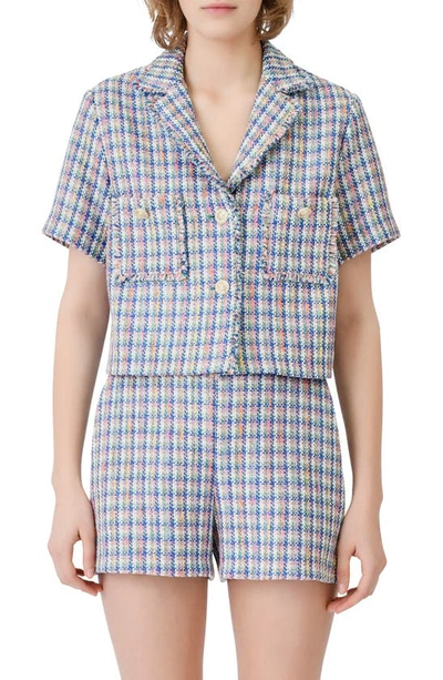 A modern take on a classic that's ready for a warm luncheon event, this pastel and metallic tweed jacket features short sleeves for a light, breezy feel. Perfect worn on its own, it has a nice boxy fit complemented by frayed square pockets, while golden crested buttons give it a classic finish. Style Name: Maje Vizam Short Sleeve Tweed Jacket. Style Number: 6245399.