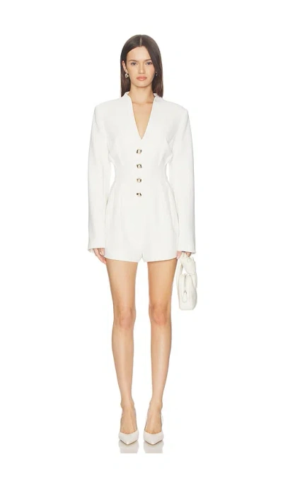 MAJORELLE Marlow Romper in White. - size XS (also in L, M, S, XL, XXS) MAJORELLE Marlow Romper in White. - size XS (also in L, M, S, XL, XXS) Self: 91% polyester 9% elastane Lining: 100% polyester. Dry clean only. Front gold-tone button closure. V-neck design. Padded shoulders. Heavyweight crepe fabric. MALR-WR93. MJRO10003 S26. Majorelle is a romantic escape driven by a sense of wanderlust and effortless feminine appeal. Based in Los Angeles, the label is girly, flirty, vintage and romantic, perfectly blending elegant dressing for the luxe dreamer who loves to travel the world.