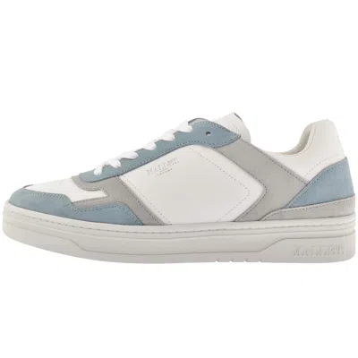 Mallet Barnsley Trainers In Grey Blue And White. A lace fastening featuring. Leather uppers featuring perforated details and suede overlays. The signature Mallet logos are situated on top of the padded tongue outstep and on the heel in gold. A chunky midsole and a branded rubber undersole.