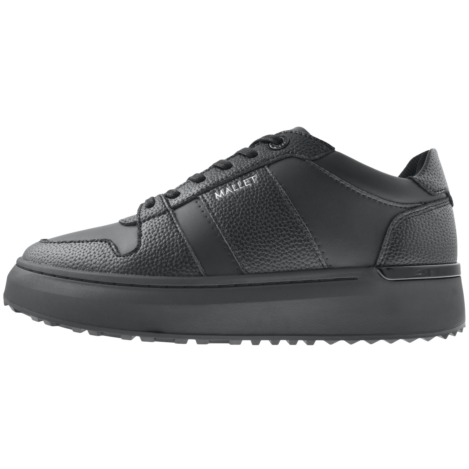 Mallet Hoxton Lite Trainers In Triple Black. A lace fastening featuring black coloured tips. Leather uppers with textured leather overlays. The signature Mallet logos are situated on top of the padded tongue outstep and on the heel panel in silver. A high shine black stabiliser with a chunky midsole and a branded rubber undersole.