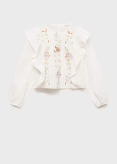 Straight design, Ruffle detail, Flowered embroidery, Round neck, Long sleeve, Elastic cuffs