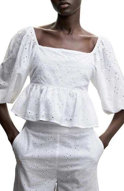 MANGO Eyelet Puff Sleeve Peplum Blouse In White