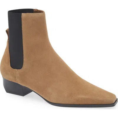A clipped block heel and square toe deliver Western-inspired sensibility to this leather bootie modernized with an elastic inset at the back. 1 3/4" heel Pull-on style with elastic gore insets Leather and textile upper/textile lining/synthetic sole Imported