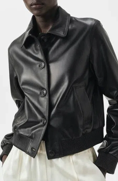 Smooth, buttery leather instantly refines the look of this tried-and-true bomber jacket trimmed with classic ribbing and topped with a timeless collar. Front button closure Spread collar Ribbed cuffs and hem Front welt pockets Lined Leather Professional leather clean Imported