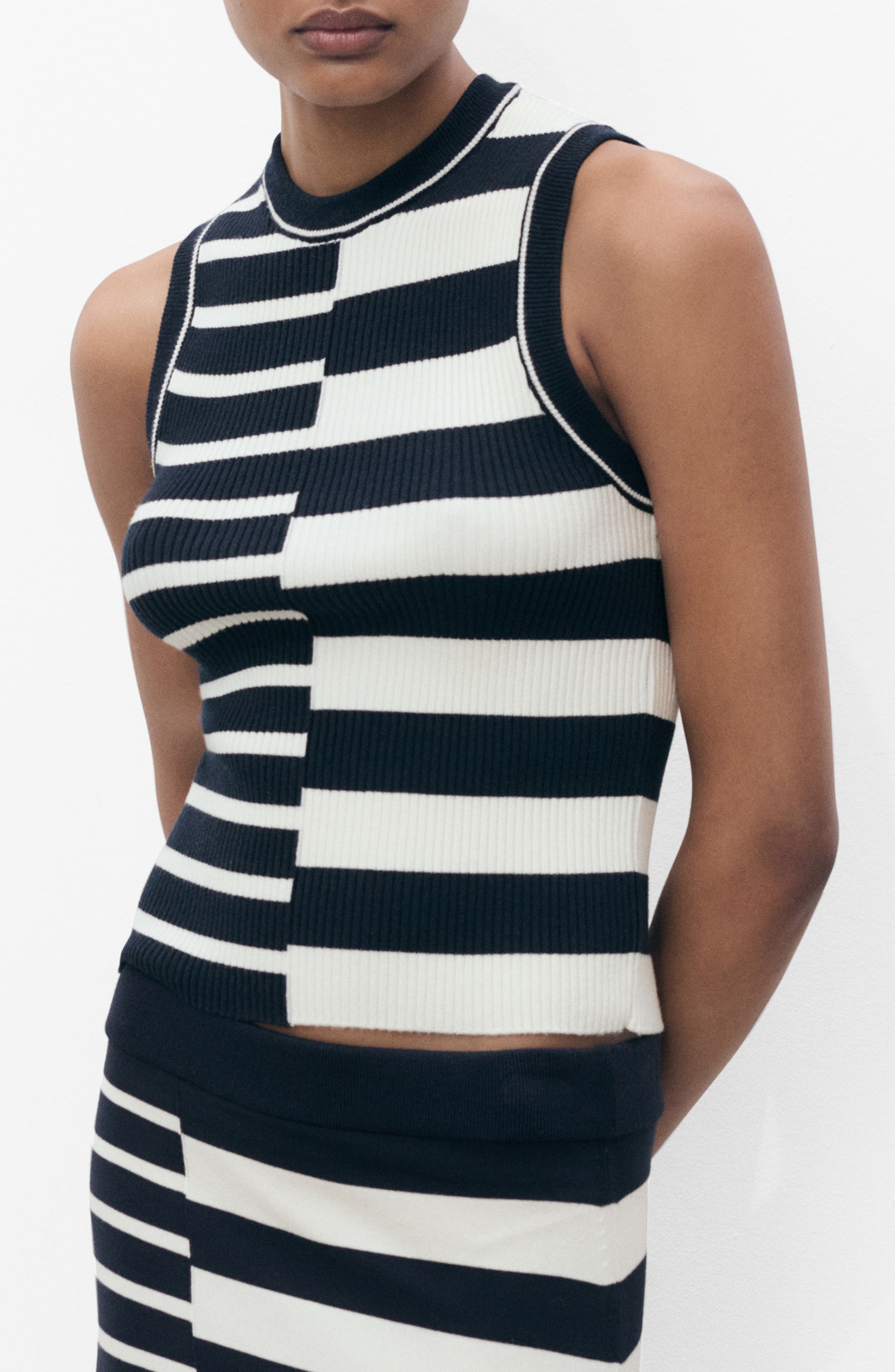 Soft ribbing enhances the close fit of this sweater-tank knit with a mesmerizing striped pattern. 22" length Crewneck Sleeveless 52% viscose, 28% polyester, 20% polyamide Machine wash, line dry Made in Turkey