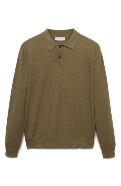 MANGO Structured Long Sleeve Polo Top In Medium Green