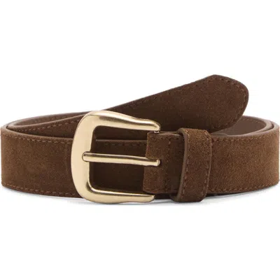 Maintain a sleek style and custom fit with this suede belt complete with a gleaming goldtone buckle. Leather/zinc Imported