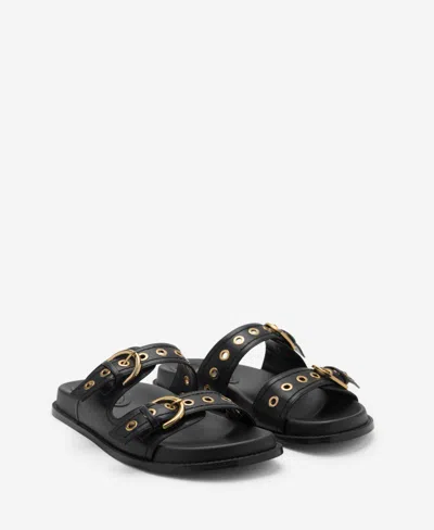 Gleaming grommet hardware brings gilded shine to this edgy slide sandal fitted with an anatomically contoured footbed. Synthetic upper, lining and sole Imported