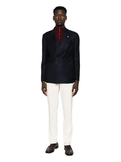 navy blue wool double-breasted button fastening peak lapels chest welt pocket