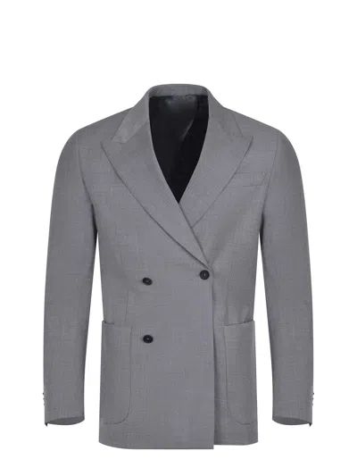 Manuel Ritz jacket made of a wool blend in steel gray. Classic lapel. Double-breasted. Long sleeves. Cuffs with buttons. Chest pocket. Side pockets. Central vent at the back. 98% wool 2% elastane.