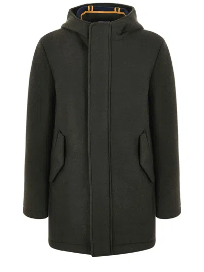 Manuel Ritz jacket in felt-effect wool cloth. Hood. Pockets with flap and snap button. Double slider zip and snap buttons. Internal pocket. Unlined with contrasting stitching. Size in photo 46 46% Polyester, 25% Acrylic fiber, 15% viscose 14% wool Composition: Misto Lana