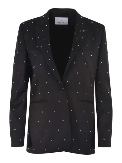 Manuel Ritz jacket in viscose blend in Black. Long sleeves. One button closure Lined. All-over rhinestone application. Wide lapels with peak tip. Two front welt pockets and one breast pocket. Central vent on the back. 66% polyester 31% viscose 3% elastane Composition: Poliestere