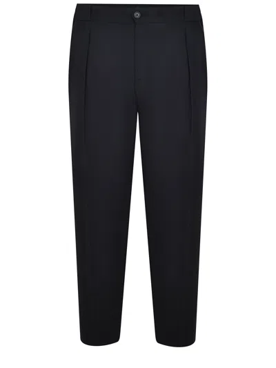 Manuel Ritz pants made of black wool blend. Closure with button and zip. Side pockets. Pleats at the front. Belt loops. Elastic waistband on the sides. Back pockets with button. Embroidered contrast logo label on the back. Baggy fit. 98% wool 2% elastane.