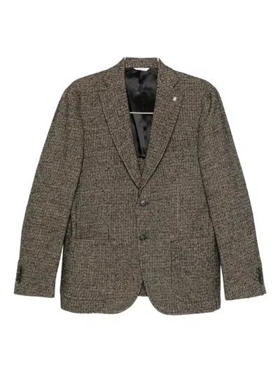 black notched lapels button fastening front patch pockets buttoned cuffs