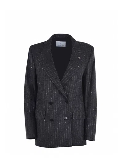 Manuel Ritz wool blend jacket in charcoal grey. Lurex-effect stripe pattern. Wide peak lapels. Patch chest welt pocket. Lined. Long sleeves. Buttoned cuffs. Single-breasted. One-button closure. Two side flap pockets. Central vent on the back. 65% Wool, 23% Polyamide, 7% Polyester 5% other fibres. Composition: Lana