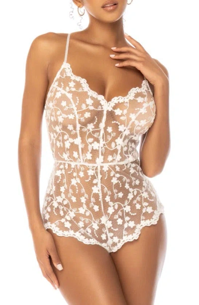 Embroidered vines of delicate flowers adorn this romantic, sheer romper that is nipped in at the waist for an hourglass fit.