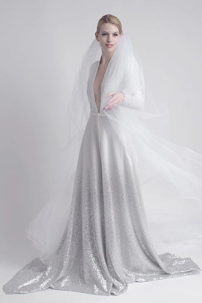Plunging NecklineLong SleevesFitted BodiceBanded WaistLong A-Line SkirtSweep TrainEvening DressImportedDry CleanColor: White