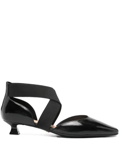 black elasticated straps pointed toe spool heel