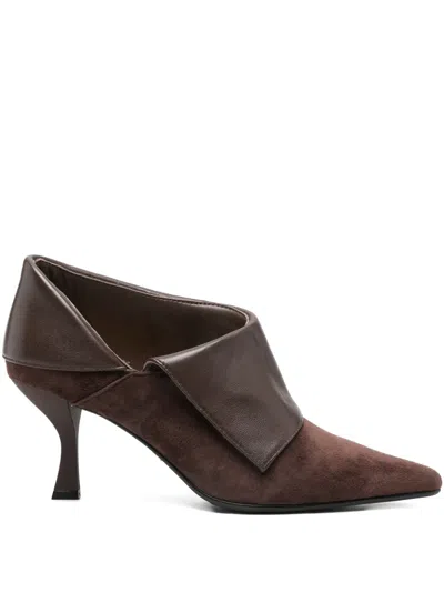 brown point toe stiletto heel crossover panel slip-on style sculpted heel