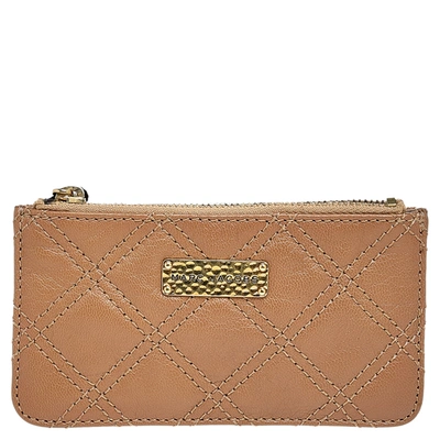 This wallet from Marc Jacobs is a great pick for everyday use. It has been created using beige quilted leather on the exterior and flaunts a gold toned logo plaque perched on the front. It has a top zip closure which opens to a well spaced fabric lined interior.