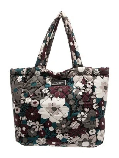 Marc Jacobs Tote Black, Blue, Burgundy & Neutrals Nylon Floral Print Silver-Tone Hardware Dual Shoulder Straps Nylon Lining & Dual Interior Pockets Snap Closure at Top | Marc Jacobs Nylon Tote in Black/Blue/Burgundy