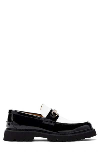 A chunky lug sole brings a handsome ruggedness to this cushioned bit loafer done in two tones of glossy patent leather. Water repellent Removable, cushioned insole with arch support Leather upper/synthetic lining and sole Imported