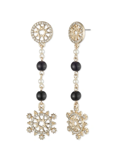 The Black Pearl Linear Earring features faux black and white pearls accompanied by crystal-embellished geometrical charms. The dainty earrings are gold plated with a gold tone and gold hardware.