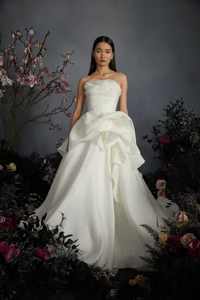 Desiree gown featuring premium silk gazar fabric in a sophisticated strapless silhouette. The distinctive sculptural draping of the skirt creates an architectural element that elevates this refined evening piece to couture status.