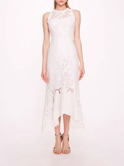 The Iris dress is a sleeveless fit-to-flare handkerchief lace midi dress.