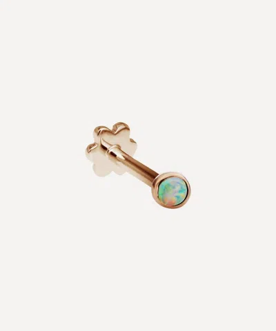 Item sold singly Opal stud earring Plain cup setting Designed to fit the tragus, forward helix, conch, Tash rook or any earlobe piercing Thread type: Tash internal slimline thread Nickel free and hypoallergenic COMPOSITION & SIZE Gemstone: Natural Australian Opal Gold Carat: Available in 0.18g 14ct Gold, 14ct Rose Gold or 14ct White Gold Dia: 0.2cm Post Length: 6.5mm, Post Thickness: 19 gauge = 0.9mm slimline A beautifully simple Maria Tash design, this opal-encrusted stud earring makes a sound addition to any ear curation. Available in multiple variations of high-polished 14 carat gold, this understated stud features a single natural Australian opal, brimming with iridescent colour in an understated plain cup setting. Complete with the brand's signature flower threaded backing, it styles beautifully in a range of lobe and cartilage piercings - wear it alone or alongside a contemporary cluster of studs and hoops for a subtly shimmering curation. Affixing the concept of beauty to durability and comfort, Maria Tash takes a niche approach to piercing, coining the term ‘fine body art’. Creating specialist, of-the-moment jewellery of the highest quality, her designs are ornately decorative, featuring fine jewellery elements and decadent embellishments. Expanding her collection, Tash continues to win the hearts of body art enthusiasts who crave a refined aesthetic.