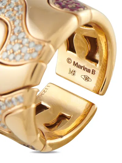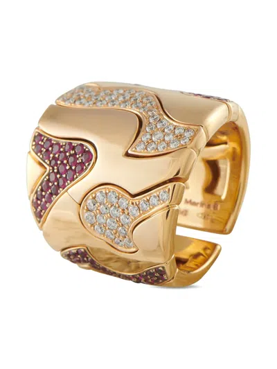 gold and red ruby diamonds 14 mm wide band 4 mm top height open band Your purchase will arrive with a gift box. Condition: EXCELLENT. This previously owned item is in near-perfect condition with no signs of damage or use.
