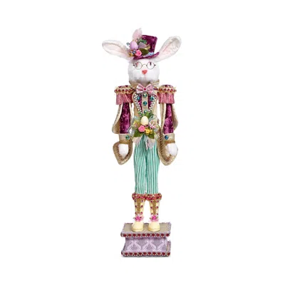 The Rabbit Nutcracker is an elegant decorative piece featuring a charming white rabbit dressed in a lavish spring-themed outfit. It wears a purple velvet jacket adorned with jewels, gold trim, and pink tassels, paired with mint green striped pants and embellished boots. Standing proudly on a jeweled pedestal, the nutcracker exudes whimsical sophistication, perfect for Easter or springtime displays.