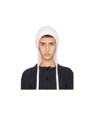 White, crown decorated with pompoms, curled brim, logo embroidered on the back, extended panels on the back.