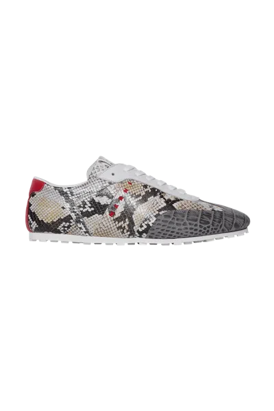The Marni Grey Multi Printed Python Sneakers are crafted from printed leather with a low-top silhouette, a color-blocked heel counter, and upper made from layered panels of croc- and snakeskin-embossed leather.