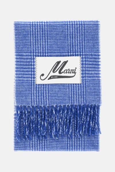 MARNI Classic Check Wool Scarf With Logo Label In Blue