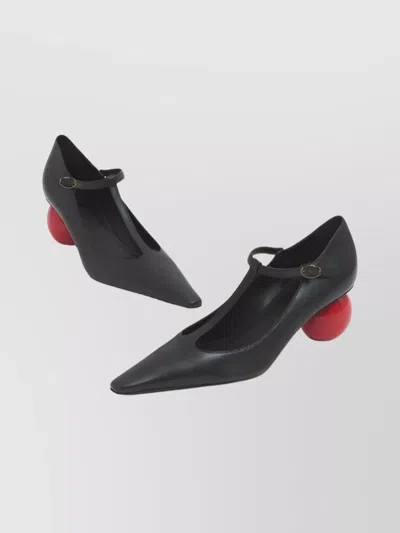 Pointed toe | Unique heel design | T-bar strap | Buckle detail